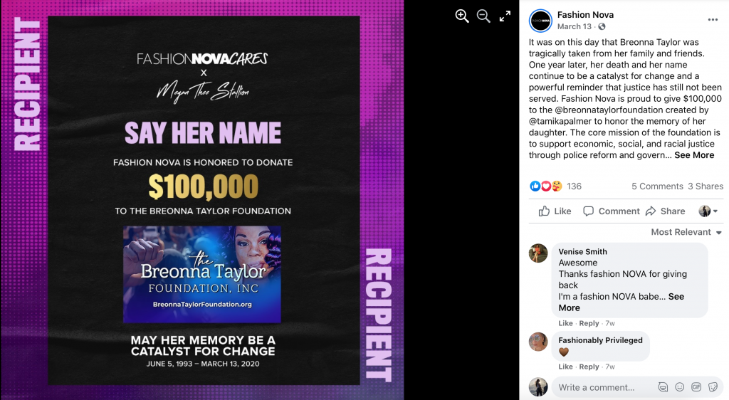 Fashion Nova has an extensive history of integrating social justice causes into its work. The company has already pledged donations to Black Lives Matter, NAACP Legal Defense and Education Fund, Know Your Rights Camp, and Women on Top.